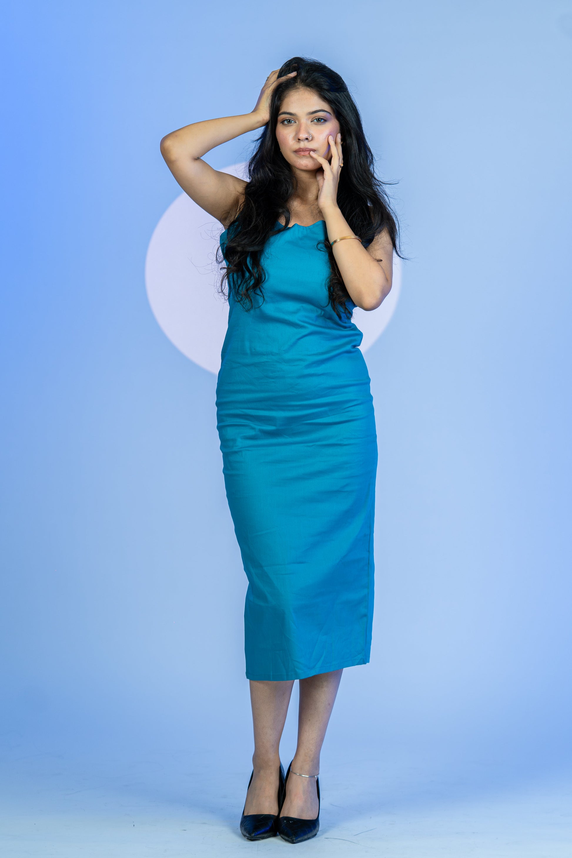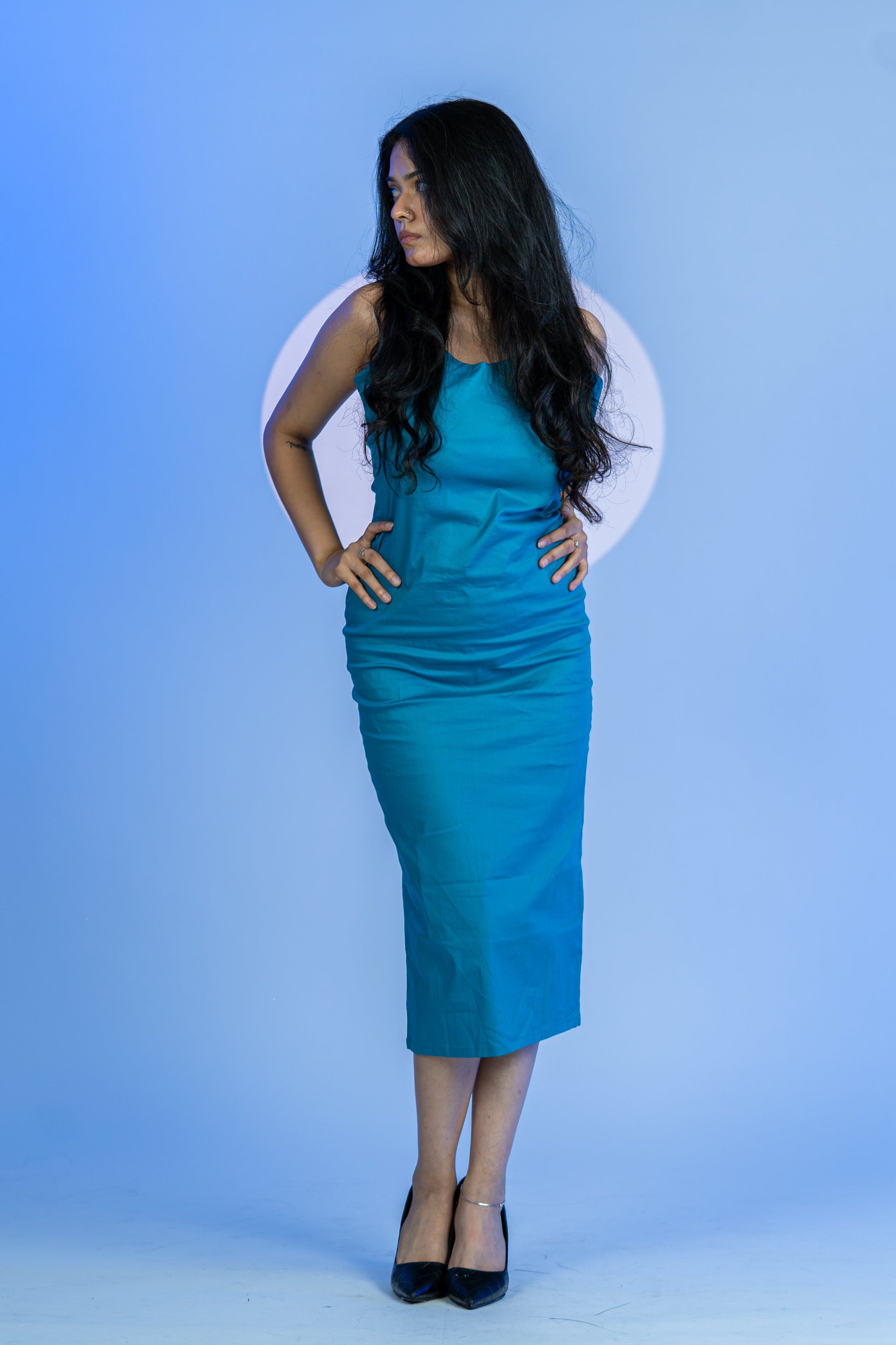 Dive into modern elegance with Aqua Reverie – a halter-neck midi dress that flows like a summer dream. Rendered in a striking aqua-blue hue, this silhouette features a flattering bodycon fit, a sleek open back, and a back slit for just the right touch of allure and movement.