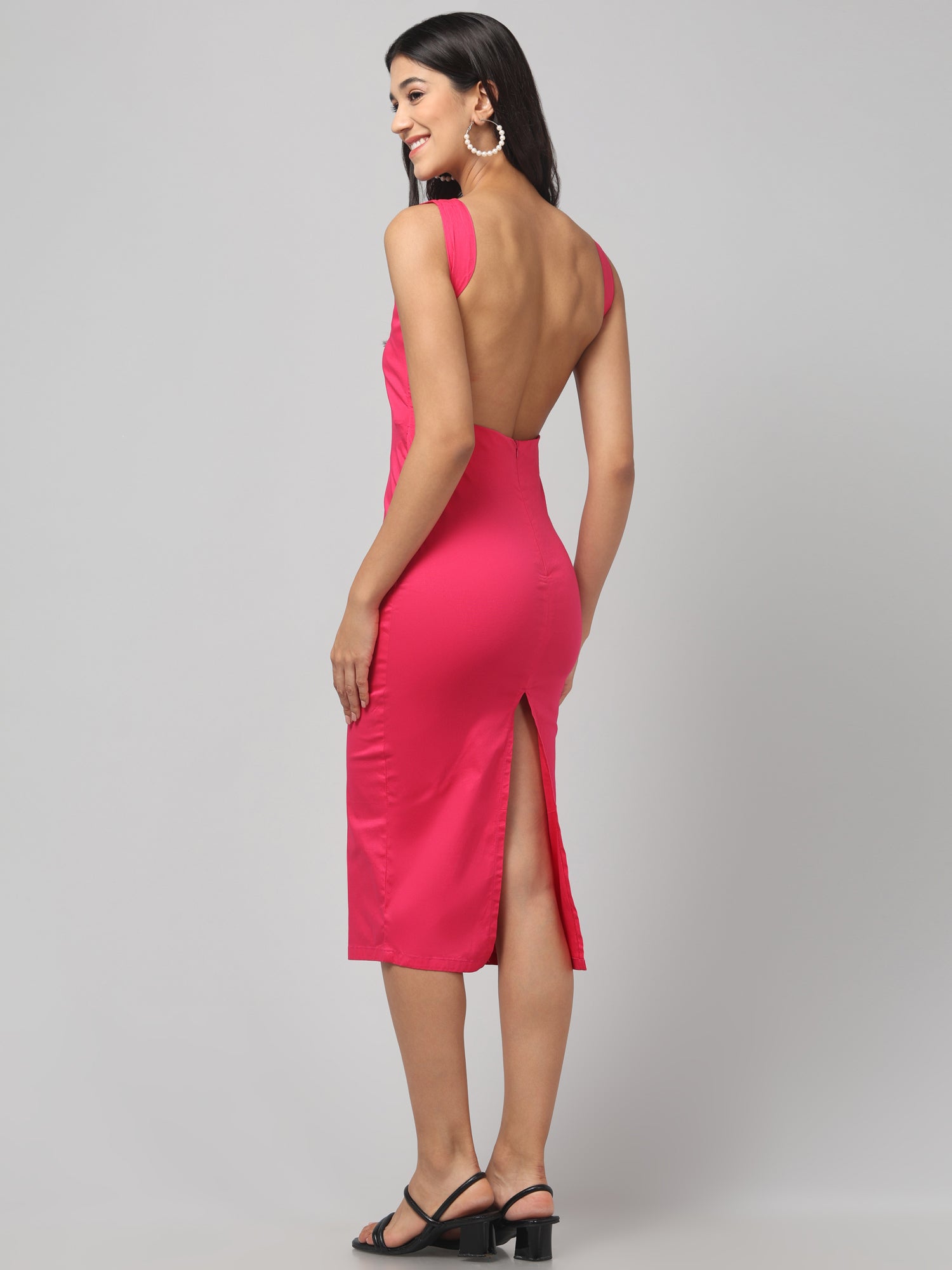 The Bare Grace Midi Dress is a modern classic with a daring twist. Made from premium banana crepe in a lively fuchsia pink, this sleeveless number boasts a sleek, minimalist front with a straight neckline that exudes elegance. But the real showstopper lies in the back — a bold, fully open-back design that brings sultry sophistication to the silhouette. With its tailored fit and center-back slit, this midi dress offers both poise and freedom of movement for your most unforgettable evenings.