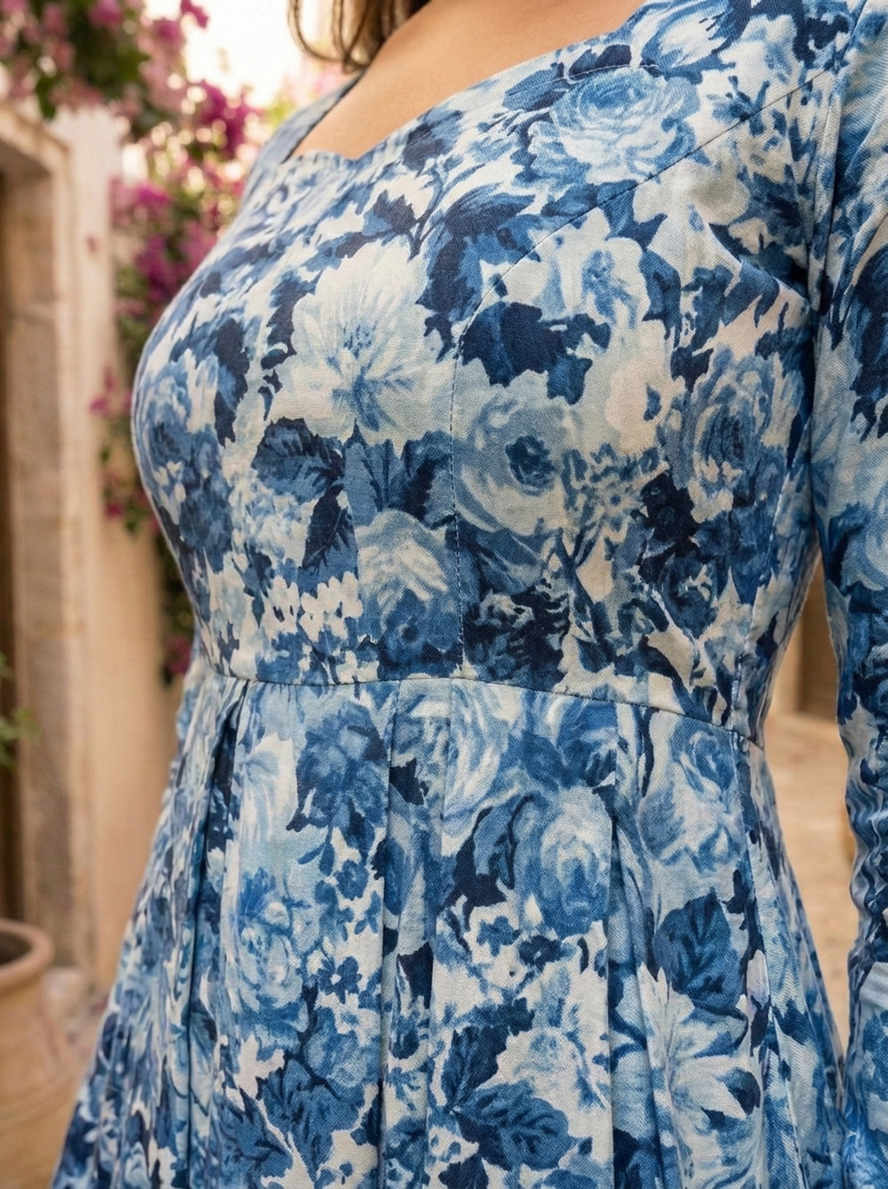 A timeless blue floral print meets a modern silhouette. This fit-and-flare dress comes with a corset-inspired bodice, long fitted sleeves, and a flowy skirt that enhances curves beautifully. Lightweight, breathable, and super flattering—ideal for summer outings, resort wear, and celebrations.