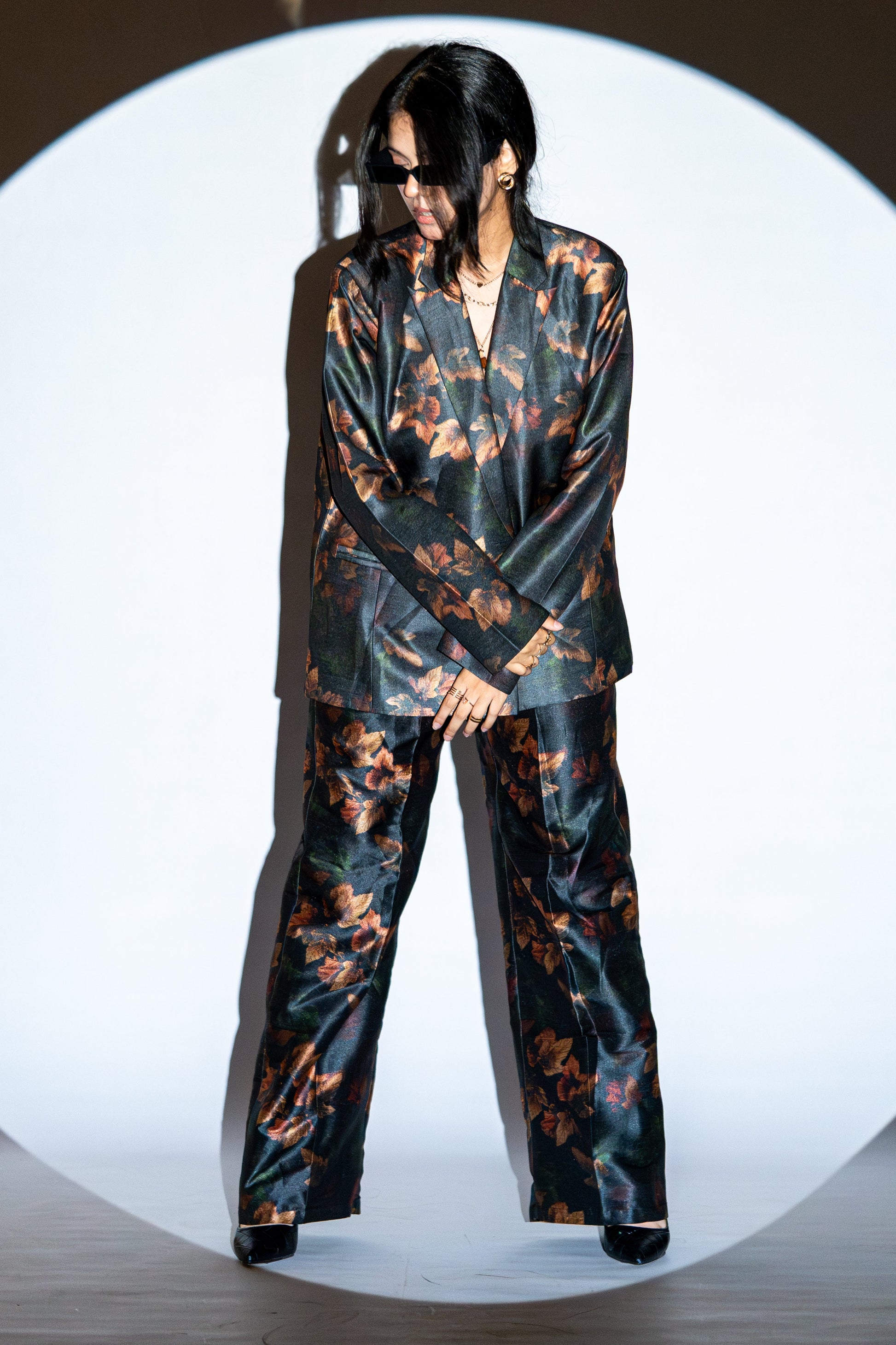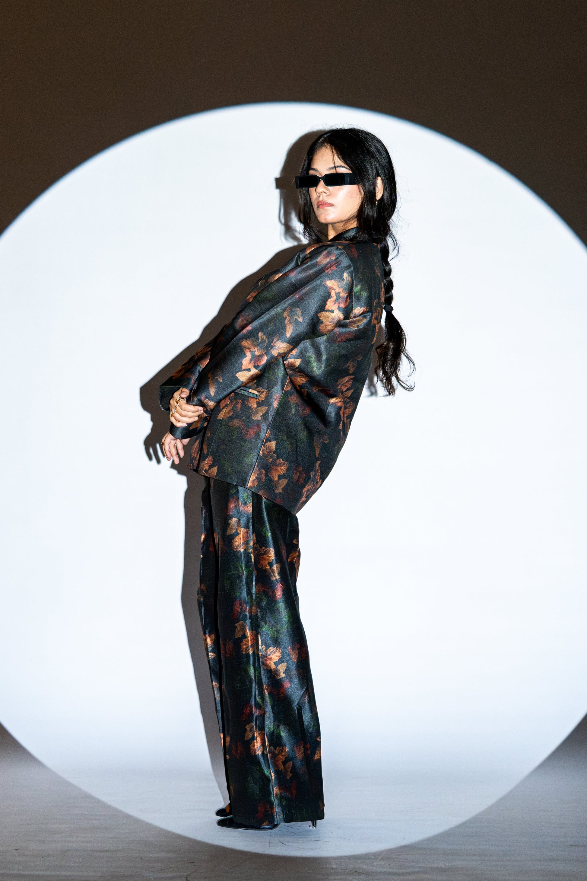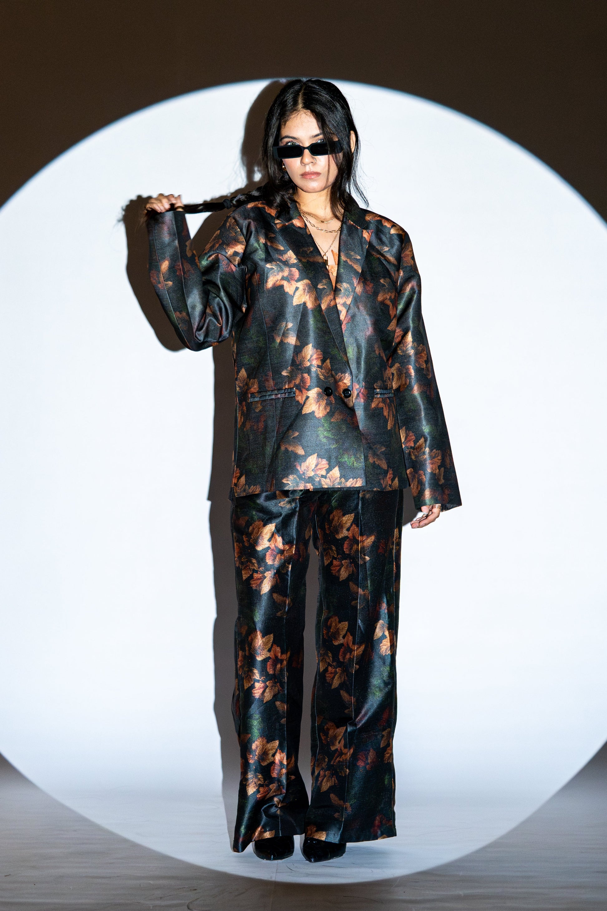 Command the night in Nocturnal Bloom – a fierce 3D print pant suit where power meets poetry. Draped in an oil-slick sheen with abstract floral embossing, this set redefines formal with a dark, romantic edge. The tailored blazer wraps you in confidence, while the straight-cut pants elongate your frame with effortless sophistication.