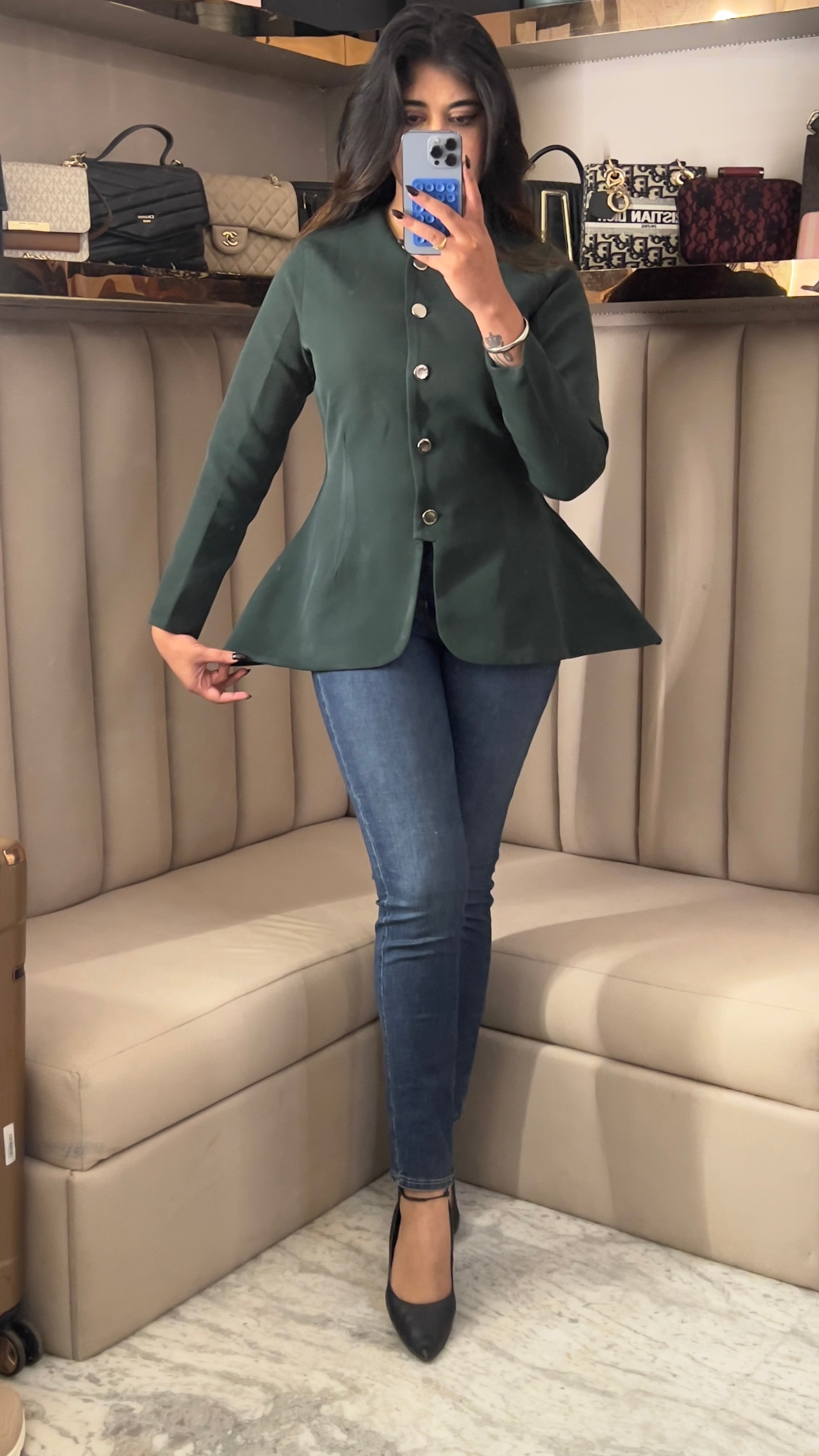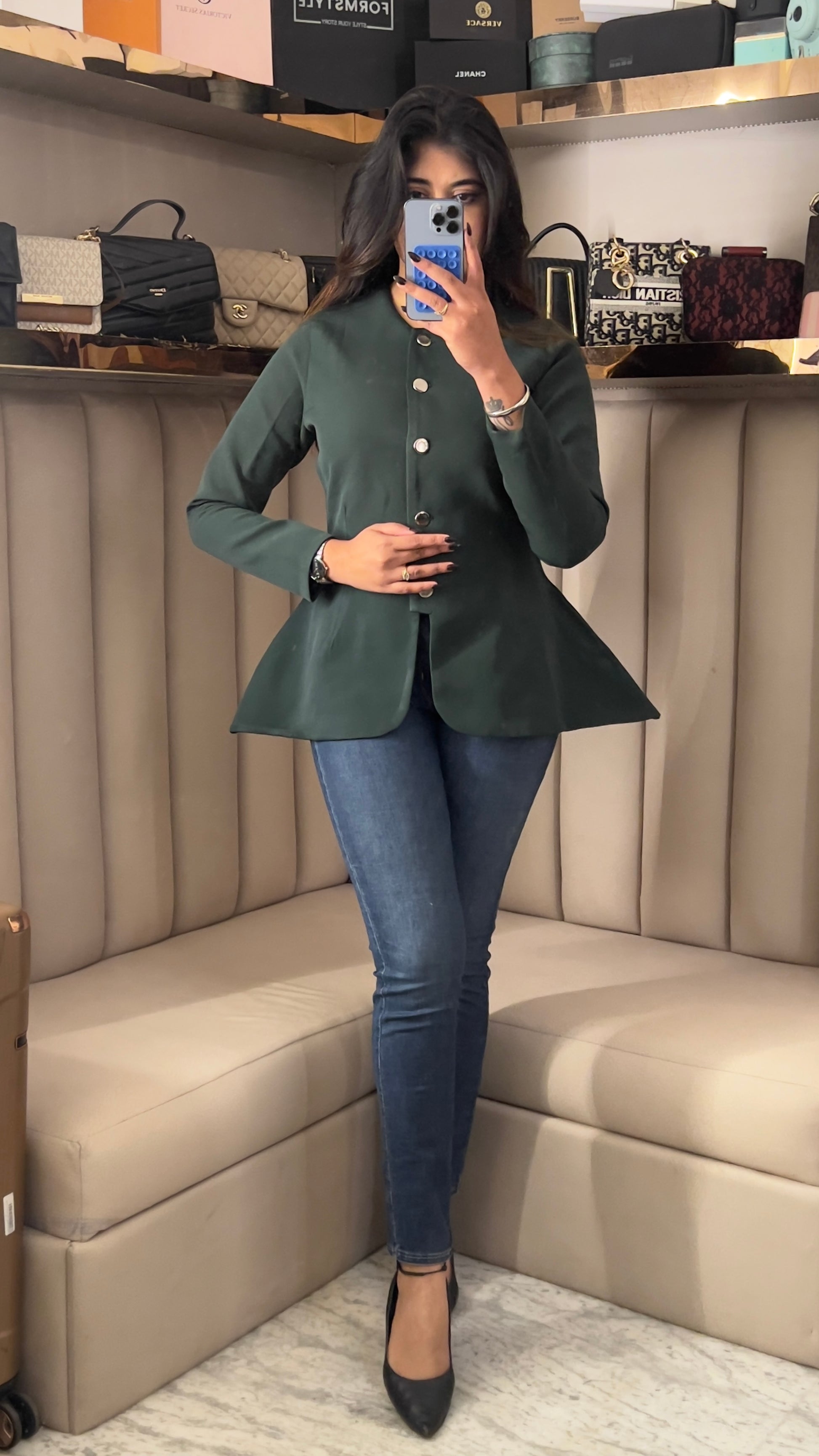 A beautifully tailored jacket designed to sculpt your silhouette with effortless sophistication. The structured peplum flare adds definition to the waist while the clean front-line buttons create a refined, modern look. Perfect for power meetings, refined evenings, and every moment when you want your confidence to speak before you do.