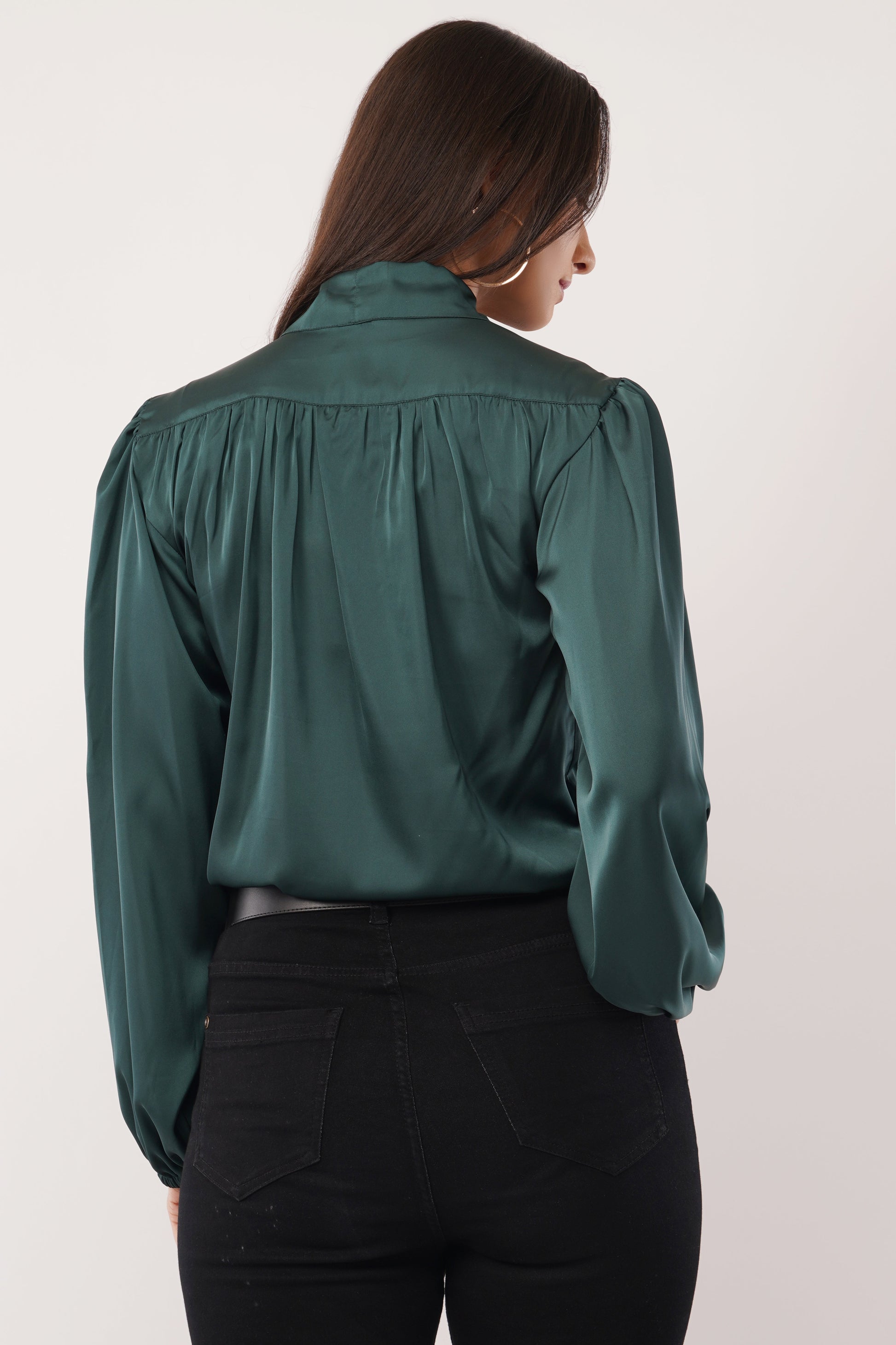 Sophistication meets grace in the Emerald Elegance Bow-Tie Blouse. Crafted from a lustrous satin fabric, this deep emerald-hued blouse radiates timeless charm. The refined bow-tie neckline adds a touch of femininity, while the billowy sleeves with gathered cuffs create an effortlessly chic silhouette.