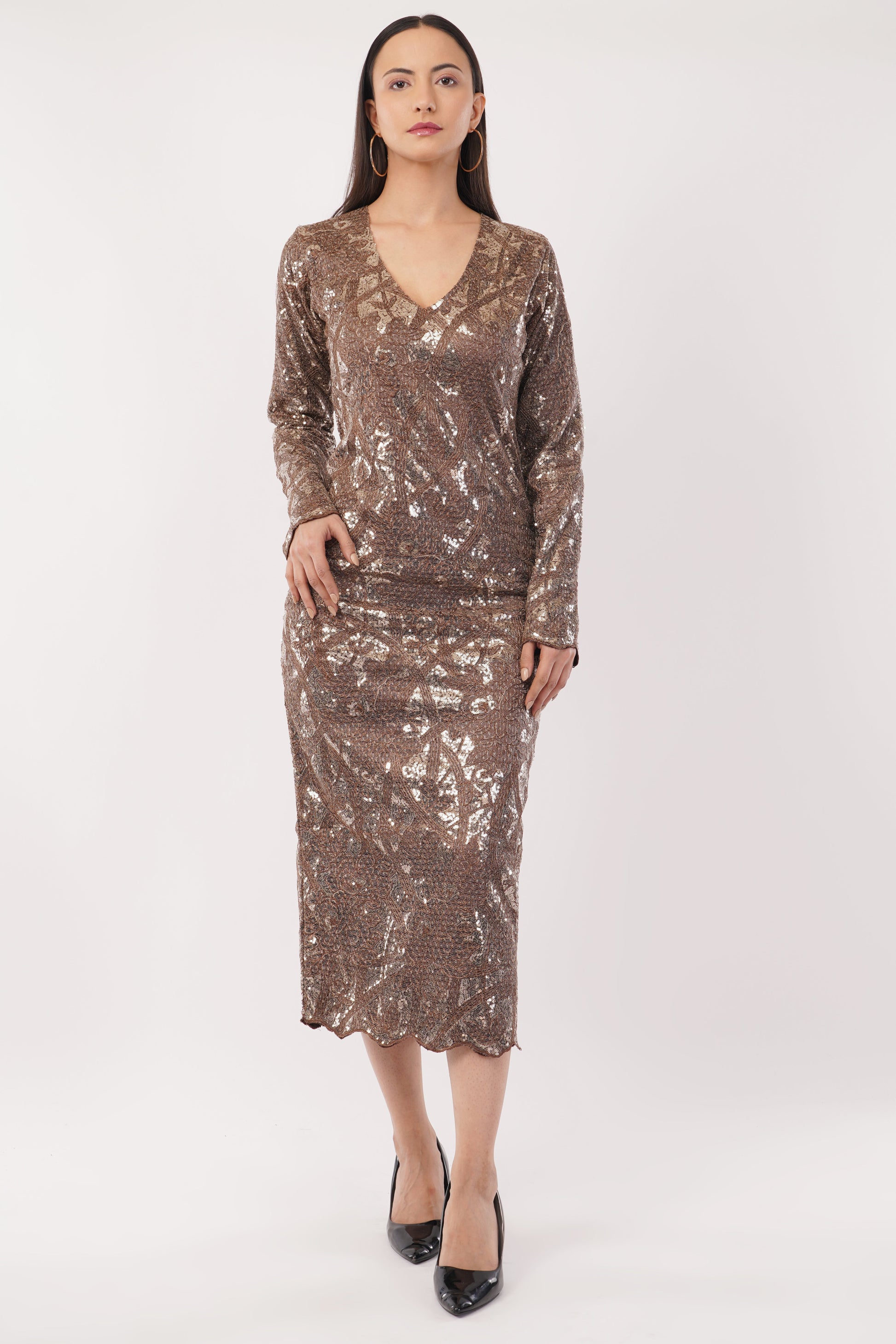 Dazzling and effortlessly glamorous, the Golden Mirage dress is a vision of luxury. Designed with shimmering sequins that catch the light from every angle, this long-sleeve midi dress radiates sophistication and charm. The elegant V-neckline enhances the silhouette, while the intricate detailing at the hem adds a touch of refinement.