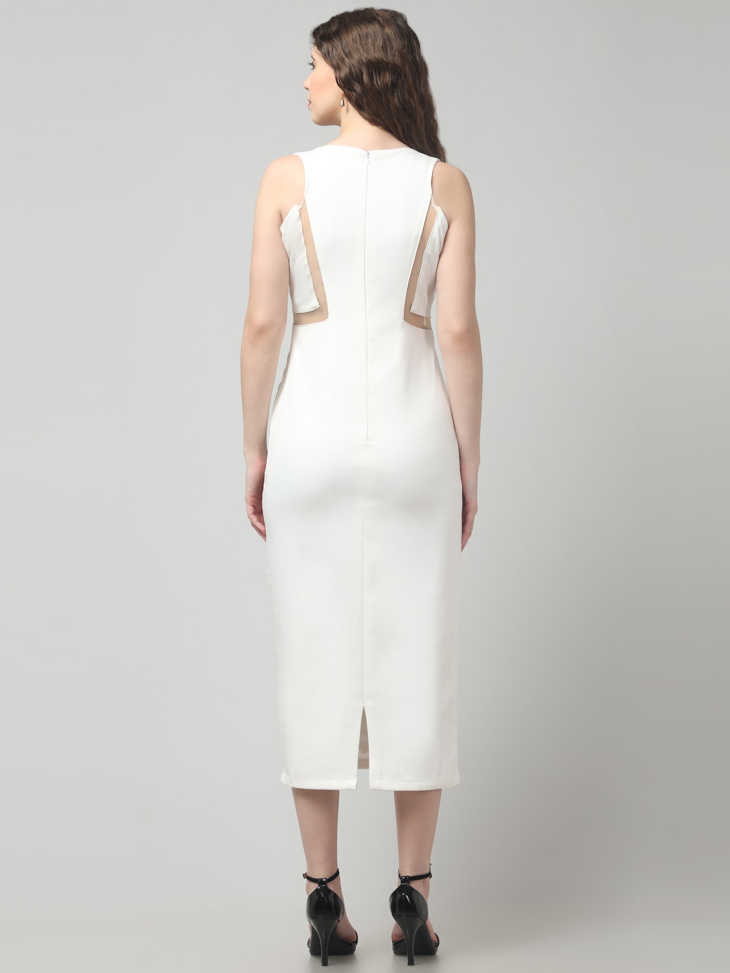 A refined ivory midi dress featuring a structured bodice with a tasteful front slit and underbust cutout. The clean silhouette and minimal design make it a timeless choice for formal evenings, celebrations, or elegant day events.