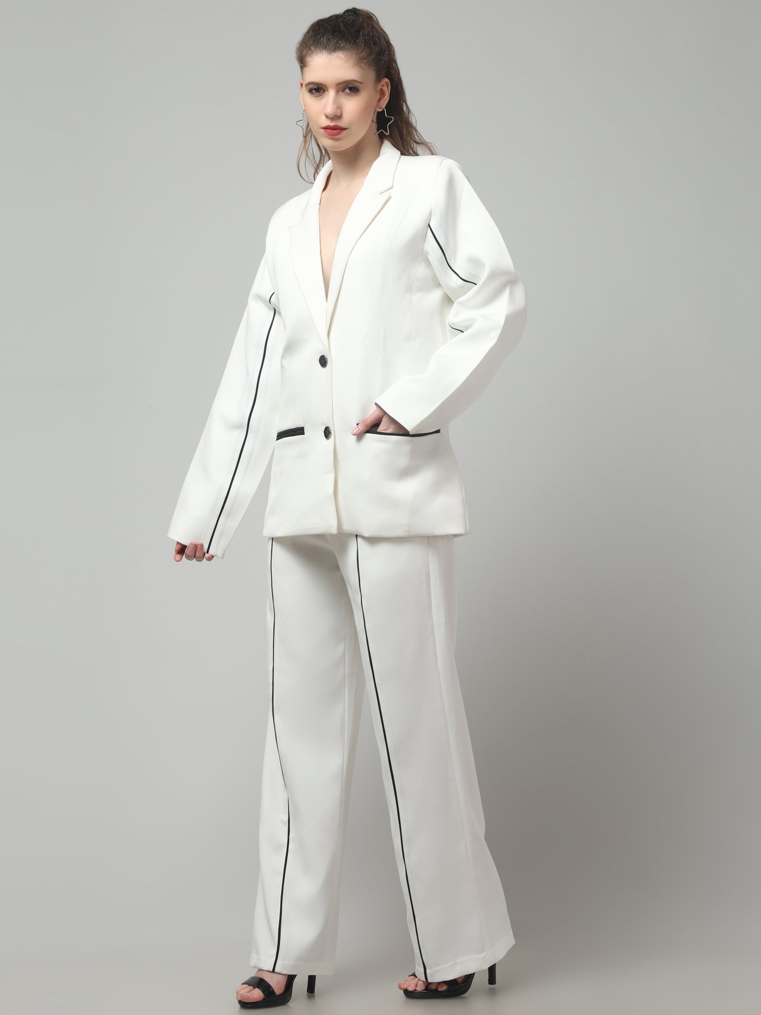 The Ivory Edge Piped Blazer Set is a refined twist on power dressing. Tailored in pristine white with sleek black piping along the seams and pockets, this double-piece co-ord exudes sharp sophistication. The relaxed blazer paired with wide-leg trousers offers structure with a soft flow — perfect for both boardroom brilliance and evening elegance.