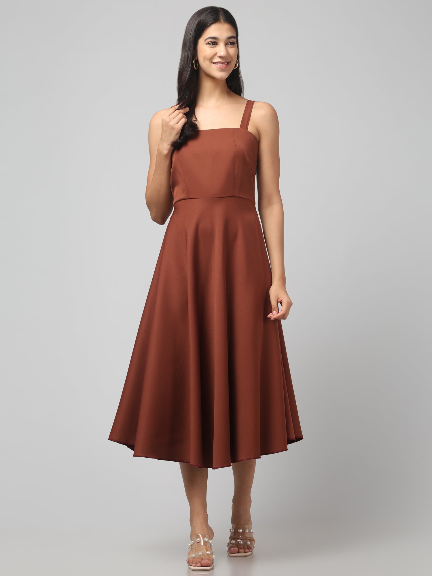 The Cinnamon Glide Dress is a fluid and flattering midi dress crafted from luxurious banana crepe — known for its soft drape and graceful movement. The rich cinnamon-brown hue enhances its elegance while maintaining a grounded, earthy warmth. Featuring a clean square neckline and broad straps, the bodice fits snugly before cascading into a full flared skirt, making every step feel like a statement.