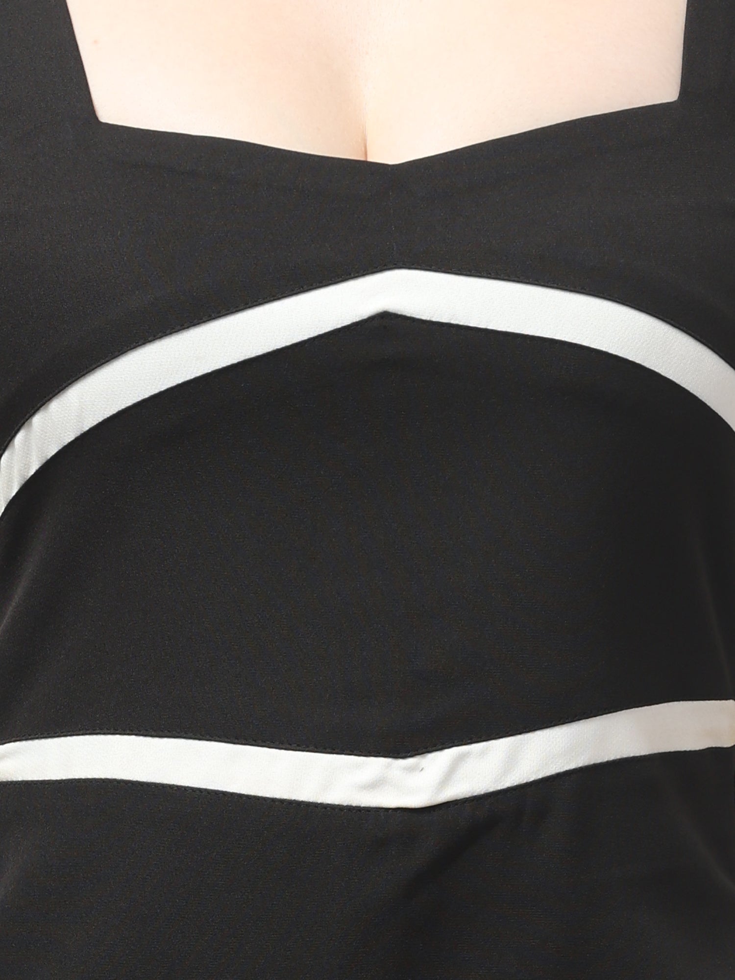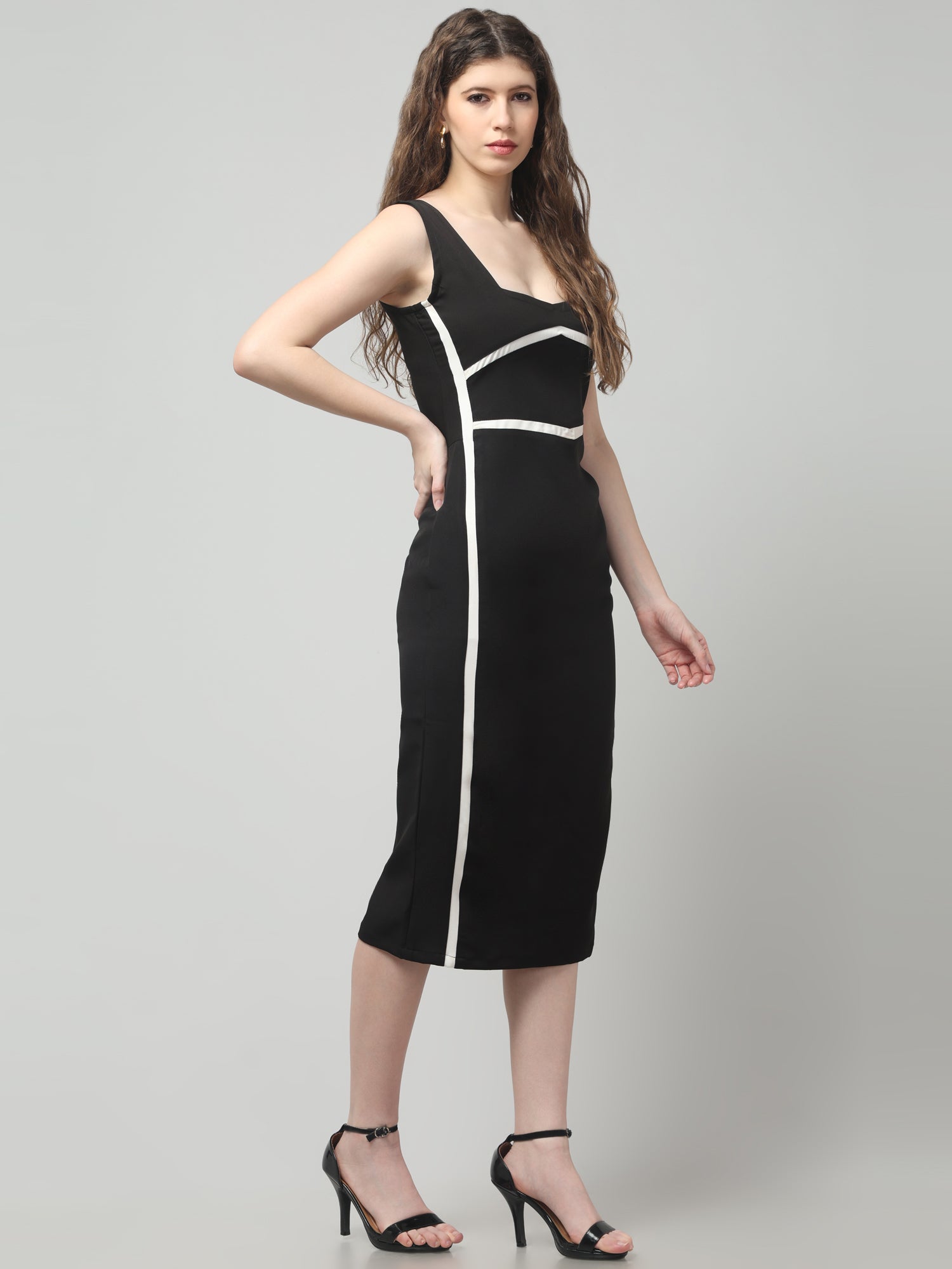 A striking black midi dress with crisp white panel detailing that accentuates the silhouette. Designed with a square neckline and body-hugging fit, this piece is perfect for evening occasions, cocktail events, or formal dinners.