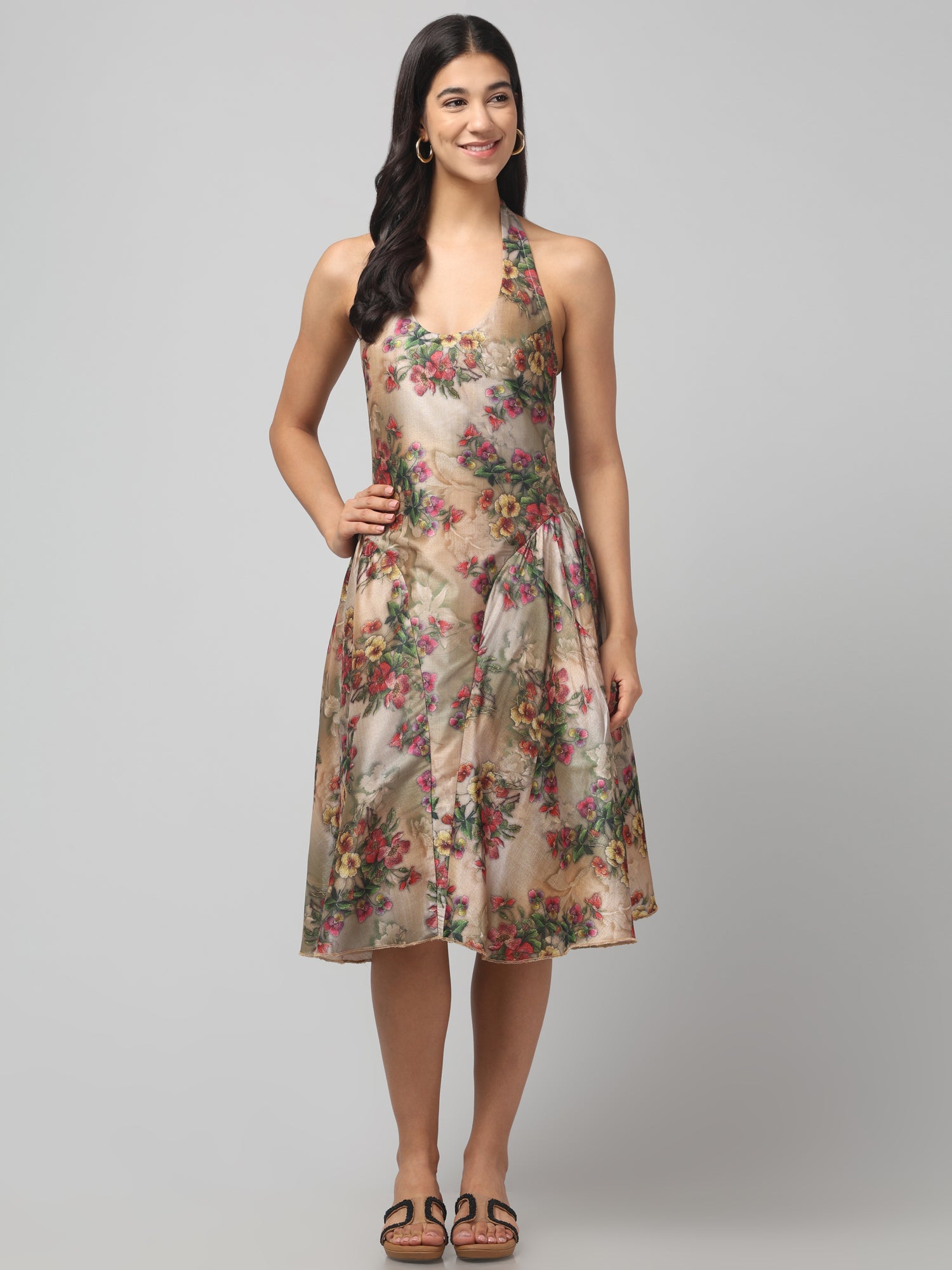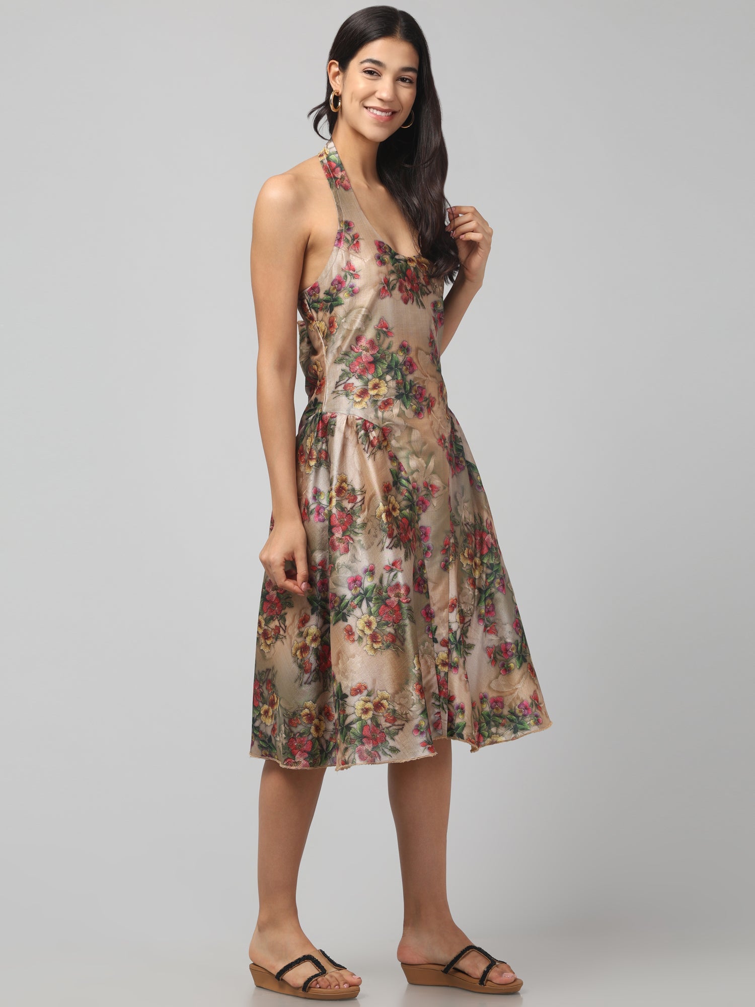 The Floral Waltz Halter Dress is a celebration of movement, romance, and modern femininity. Crafted from lightweight satin with an exquisite 3D floral digital print, this midi dress captivates with its twirl-worthy flare and soft sheen. The halter neckline frames the shoulders elegantly, while the fitted bodice flows into a voluminous skirt — making it a dreamy pick for sunlit events and festive soirées.