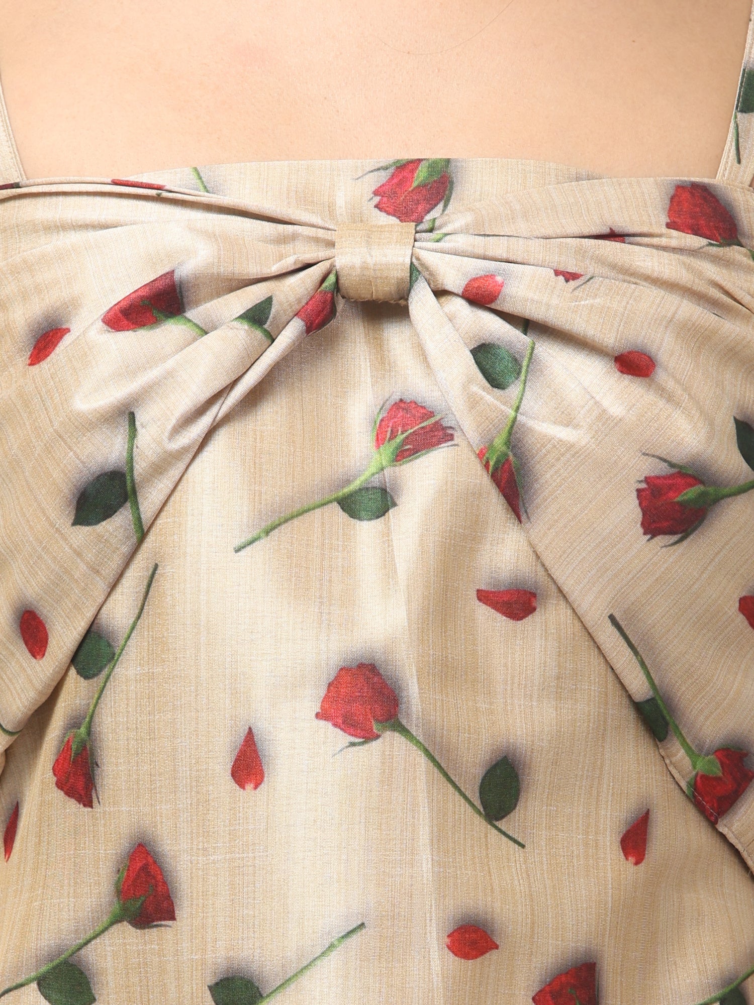 The Cherry Bloom Mini is a playful and ultra-feminine sundress crafted from luxurious satin with a delicate 3D digital cherry rose print. The soft champagne base acts as a canvas for scattered blooming buds, while the front-tie bust detail and gently flared silhouette add a flirty touch. With slender spaghetti straps and pocketed sides, this dress balances charm, comfort, and modern romanticism.
