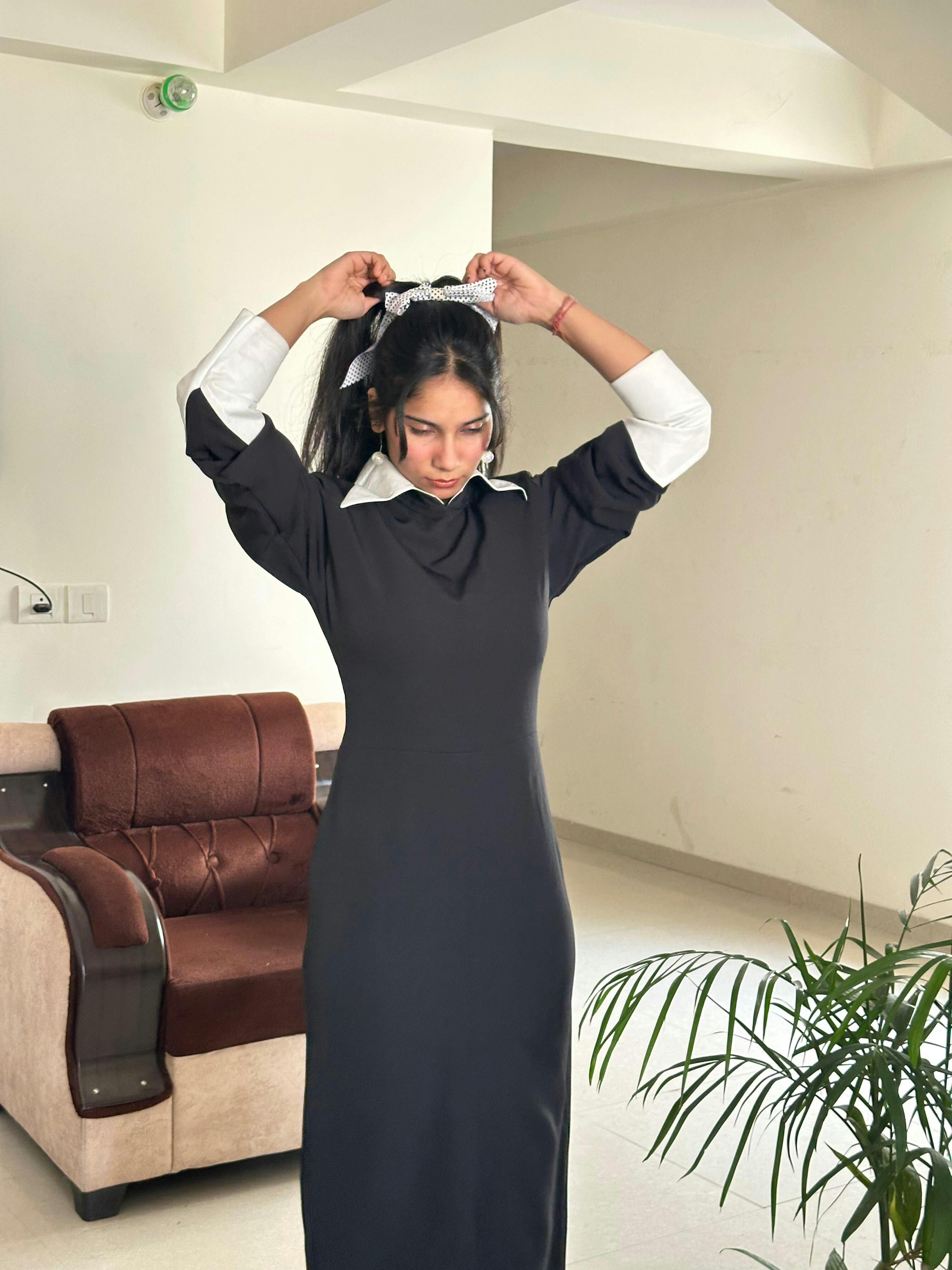 A nod to power dressing with a fashion-forward twist — the Monochrome Authority Midi Dress features a crisp white contrast collar and cuffs on a sleek black base. The tailored silhouette, full sleeves, and front slit deliver structure, sophistication, and effortless command.