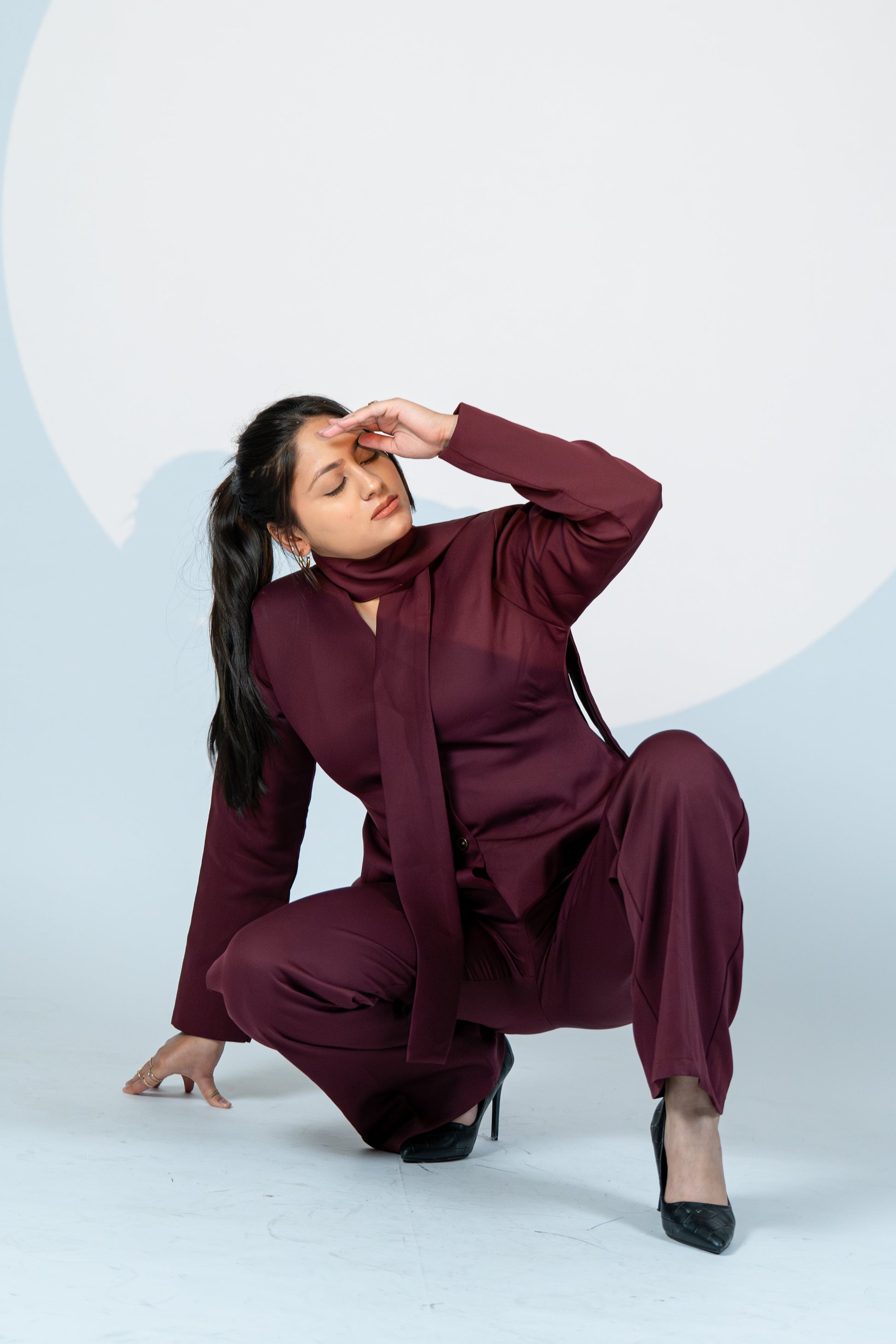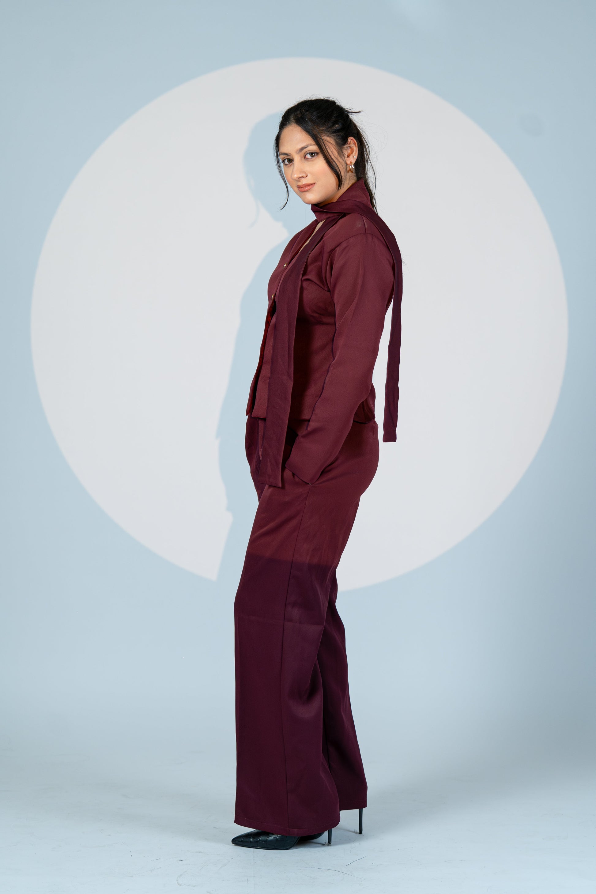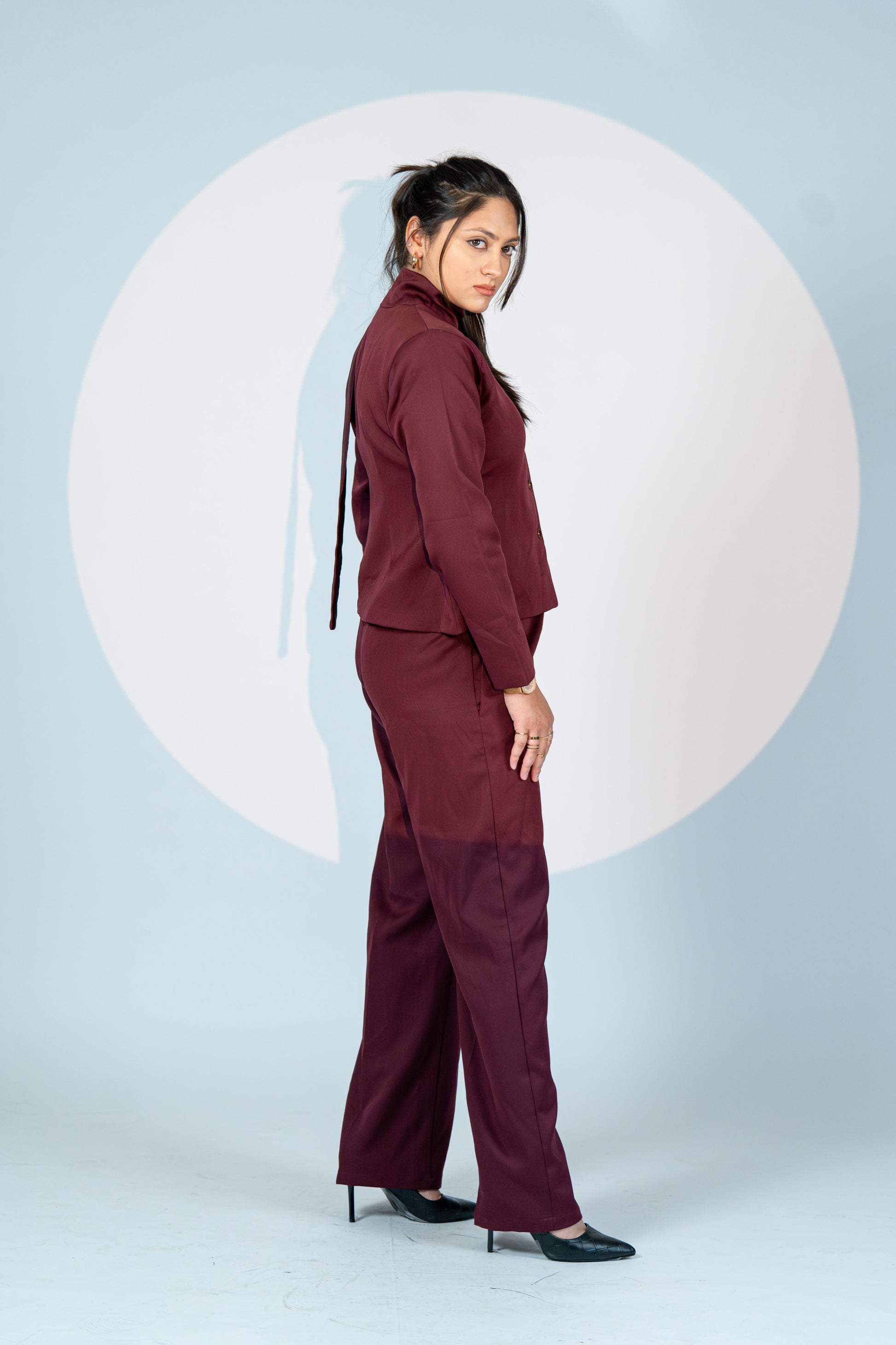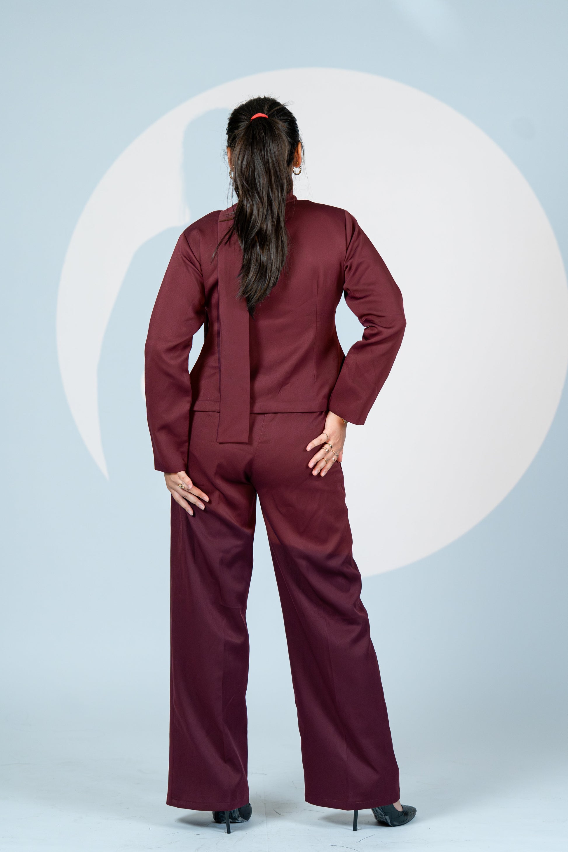 Own every room in Wine Authority – a commanding co-ord set that merges contemporary tailoring with feminine finesse. Designed in a rich merlot hue, the set features a structured jacket with a built-in scarf neckline, adding fluidity and drama to its bold silhouette. The matching wide-leg trousers bring sharp sophistication, balanced by sleek seams and perfect length.