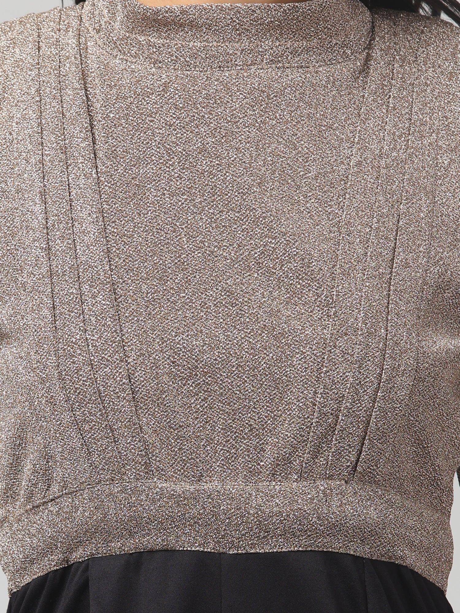 The Twilight Fusion Jumpsuit is a refined blend of chic and comfort — tailored for the modern woman who owns the boardroom by day and dines in elegance by night. This two-tone jumpsuit features a textured glitter knit bodice with long sleeves and a high neckline, paired with flowy black palazzo-style pants that elongate the frame. Designed for both structure and movement, this piece offers an effortlessly polished silhouette with a touch of glamour.