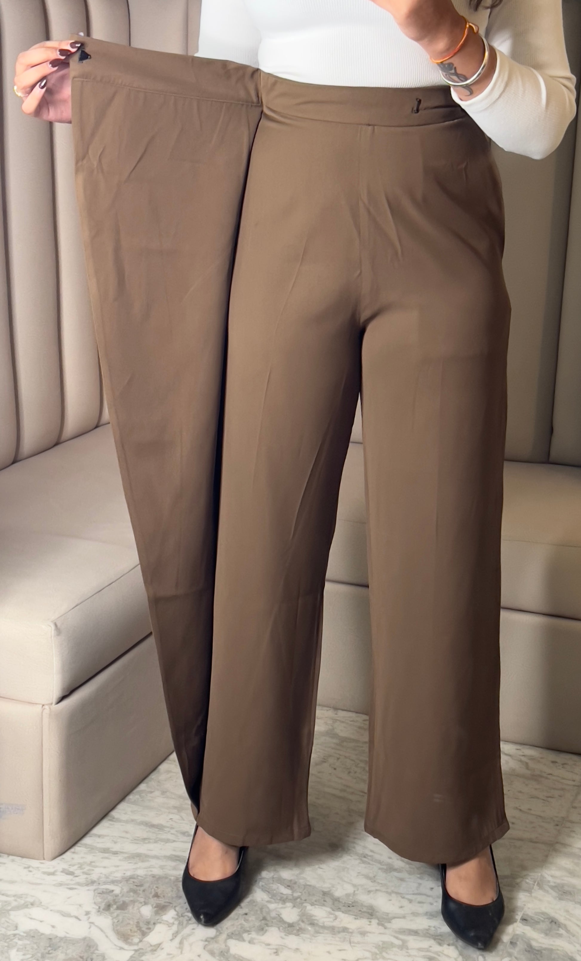 These pants feature a chic overlap front design that adds a modern twist to the classic wide-leg silhouette. Crafted in a rich earthy brown shade, they offer both sophistication and comfort. The clean-cut layering at the front creates an elegant drape effect, making them versatile enough for formal office wear or elevated casual outings. Pair them with a fitted top and heels for a polished, contemporary look.