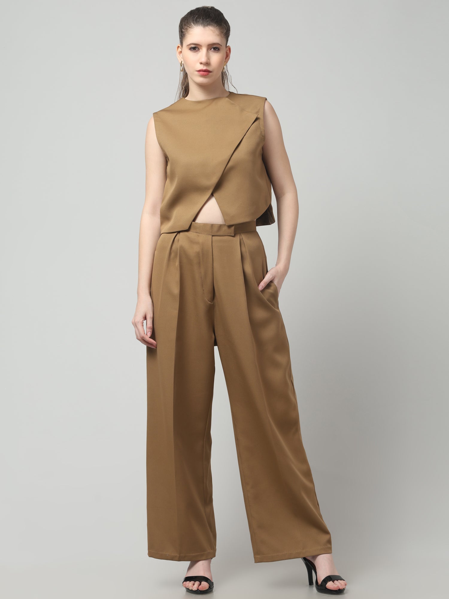 Minimalist with a sharp twist — the Sandstone Angular Co-ord Set is a masterclass in modern tailoring. The sleeveless boxy top features a bold asymmetric overlay and clean cutout detail, paired with high-waisted pleated wide-leg trousers. Designed to turn heads with effortless ease, this set blends structure with movement.