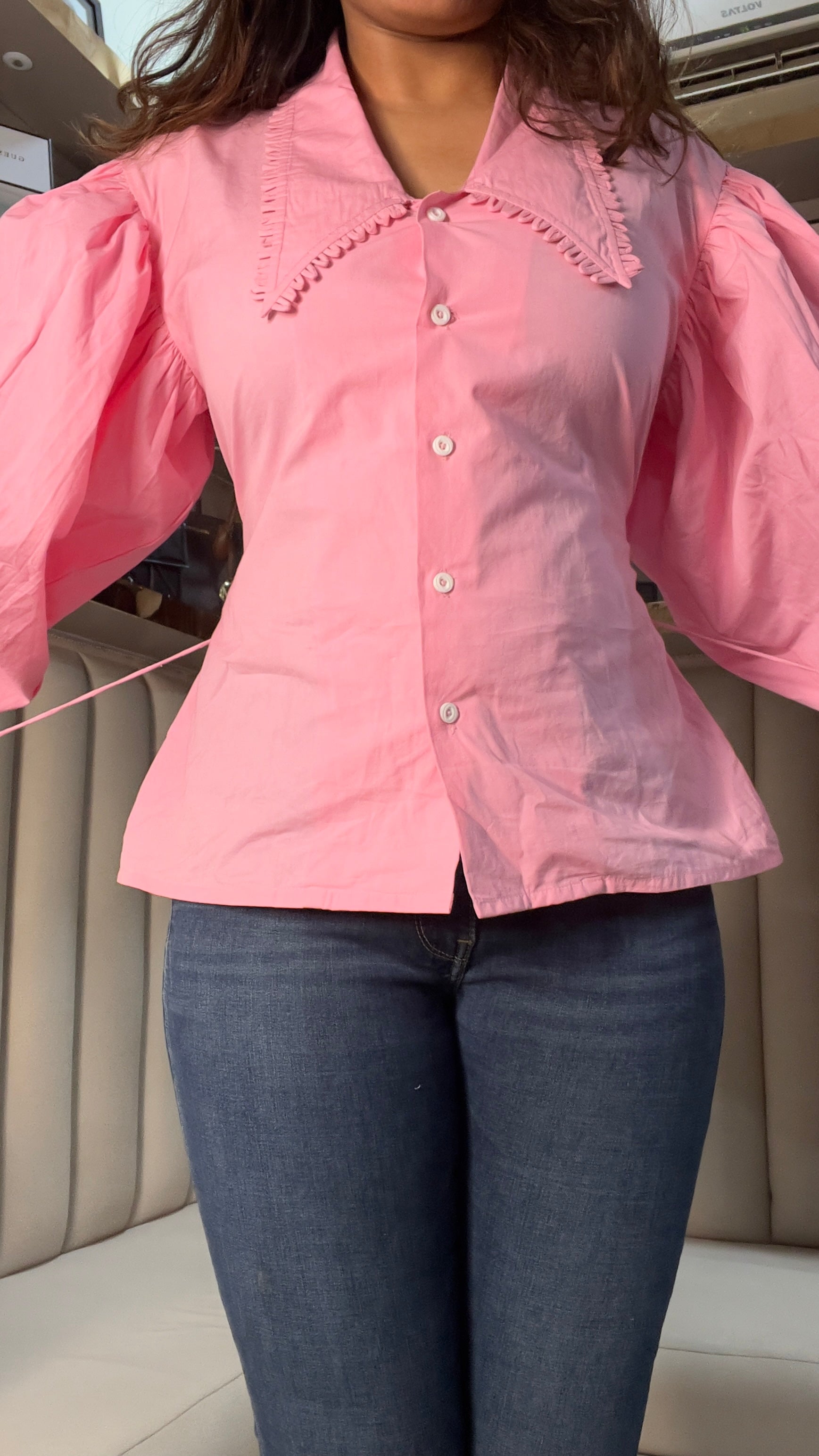 This Rose Puff Elegance Shirt is a vibrant rose-pink button-down designed to make a statement with its oversized puff sleeves and delicate stitched detailing on the collar. Crafted from a lightweight cotton blend, it offers breathable comfort while maintaining a polished look. The shirt features a relaxed, slightly boxy fit, making it versatile enough to be styled tucked into high-waisted jeans for a chic casual outfit or paired with tailored trousers or skirts for a more sophisticated, work-ready vibe. The tonal buttons and gathered sleeves add a touch of refinement, making this piece a perfect blend of elegance and modern style.