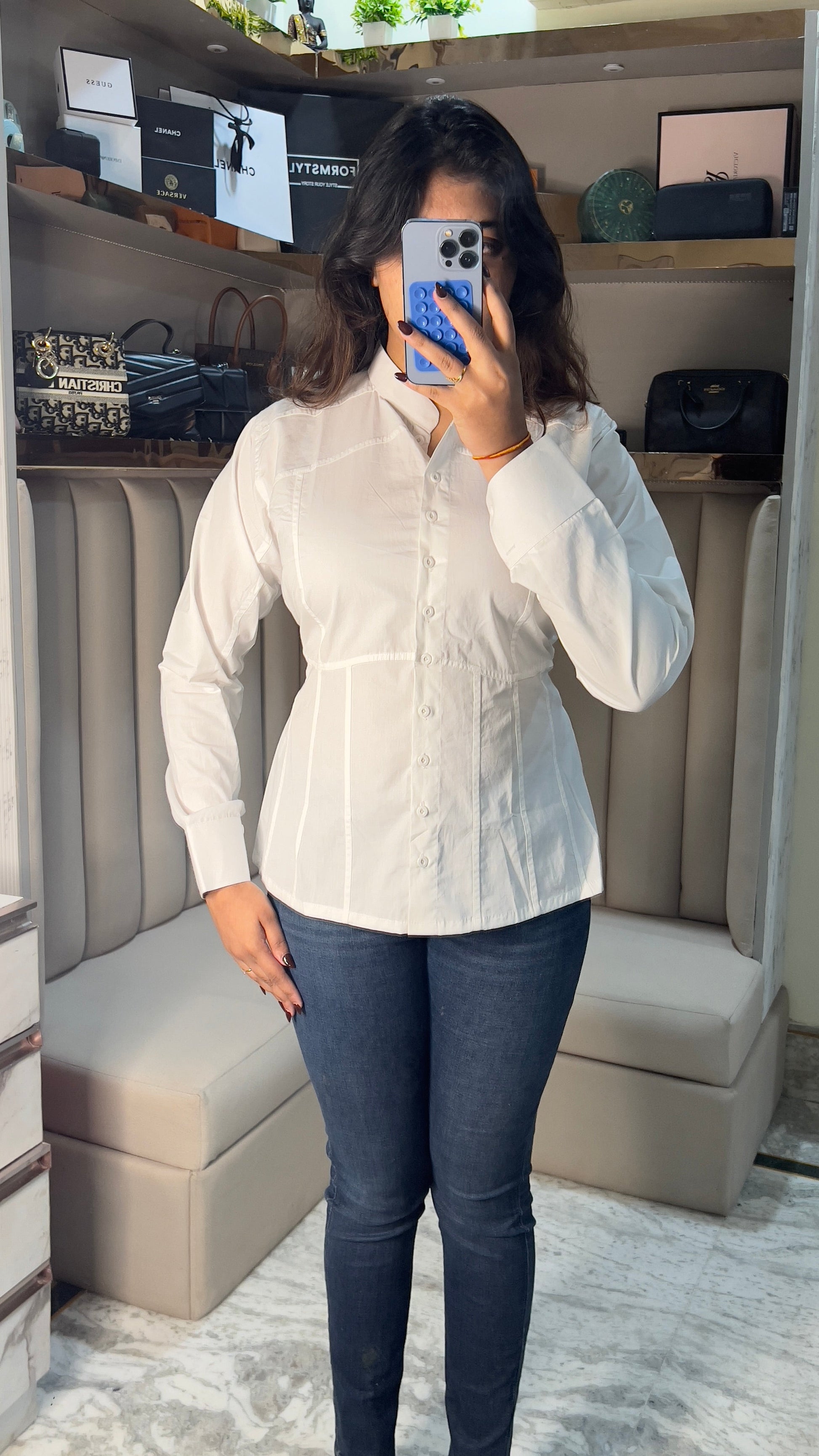 The Sculpted Elegance Shirt is a refined essential that beautifully accentuates the feminine form with its tailored fit and structured silhouette. Crafted in crisp white fabric, it features subtle paneling and dart detailing that cinches at the waist, creating a flattering hourglass shape while maintaining a polished, professional appeal. The clean button-down front and sharp collar add timeless sophistication, making it versatile enough to transition seamlessly from boardroom meetings to evening outings. A modern wardrobe staple, this shirt is perfect for those who appreciate minimalism with an edge of elegance.