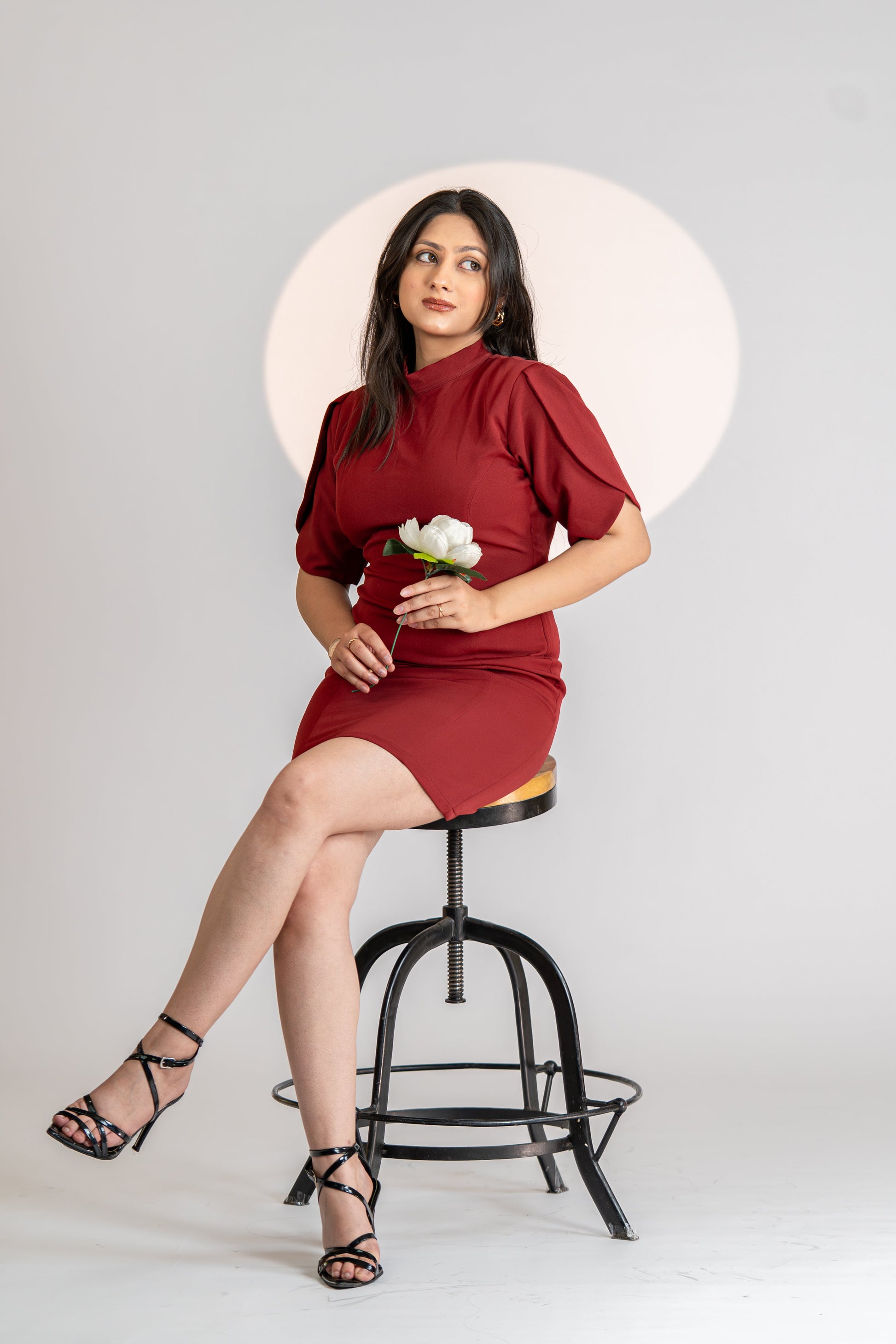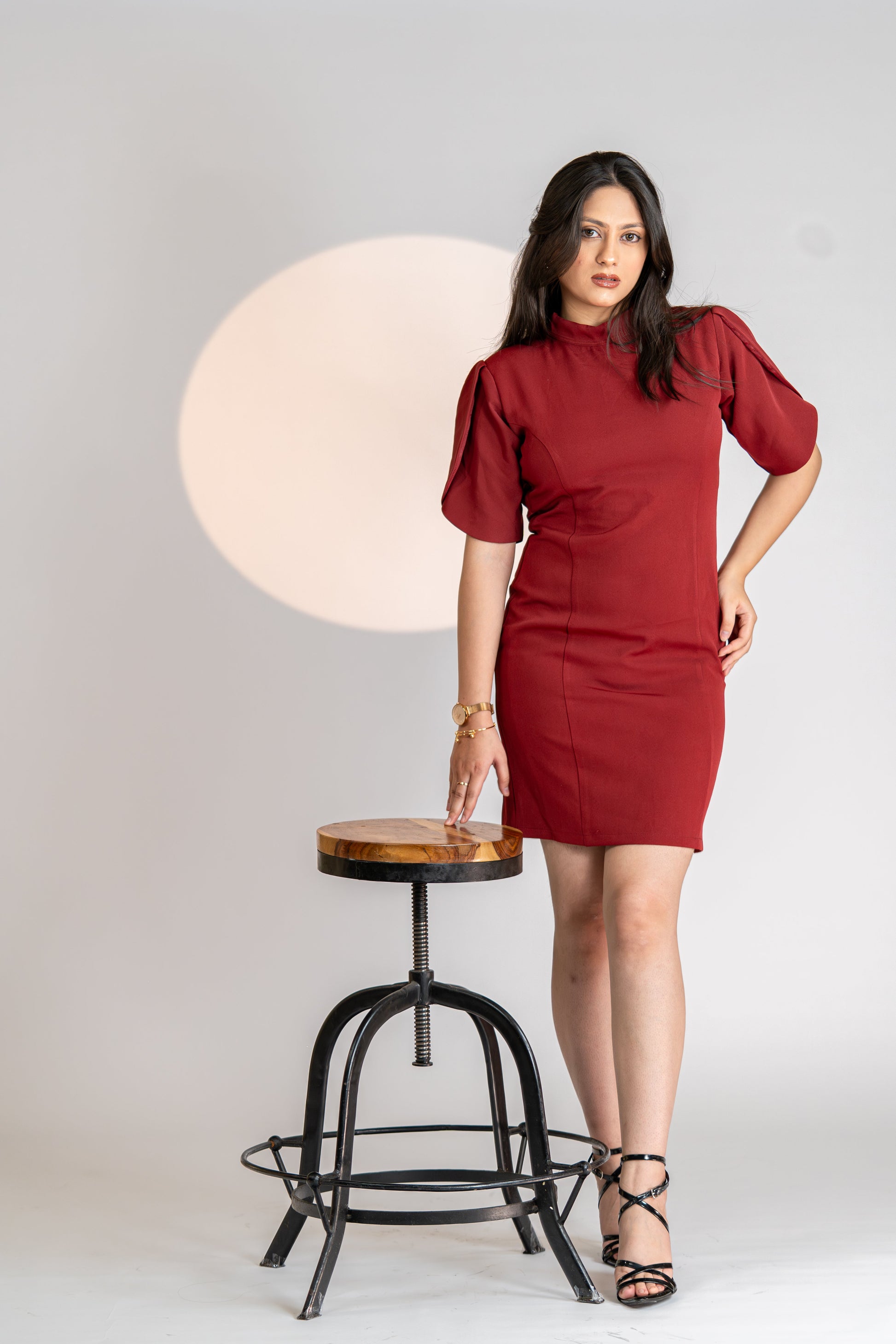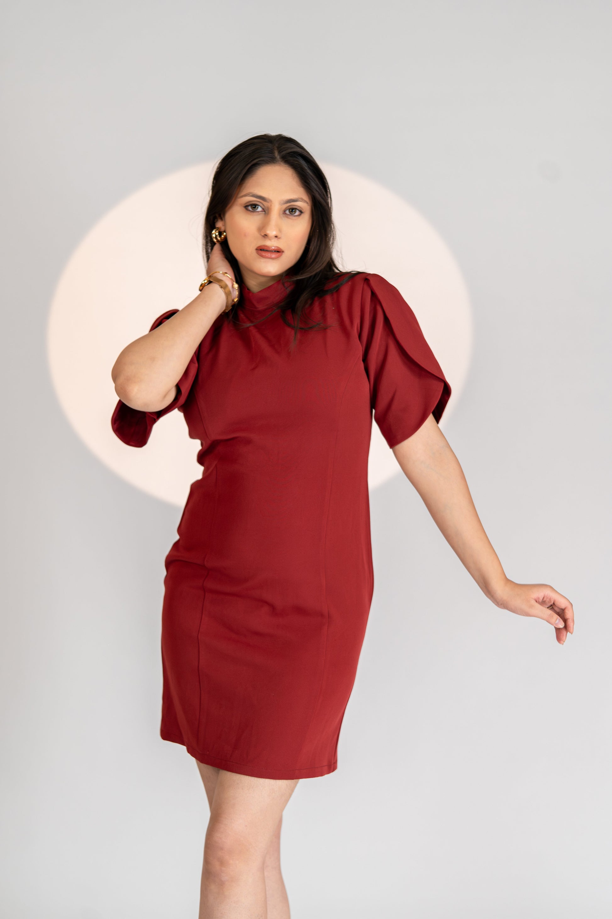 Unveil timeless elegance with Crimson Poise – a structured wine-red bodycon dress designed to command attention. Crafted from premium stretch fabric, it sculpts your silhouette while ensuring comfort. Featuring subtle puffed half-sleeves and a high neckline, this piece brings vintage charm with a modern edge. Whether you’re stepping into a boardroom or a soirée, this dress is your power move in crimson.