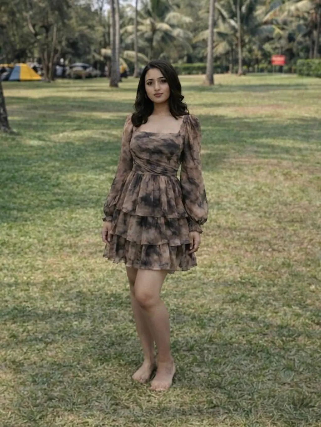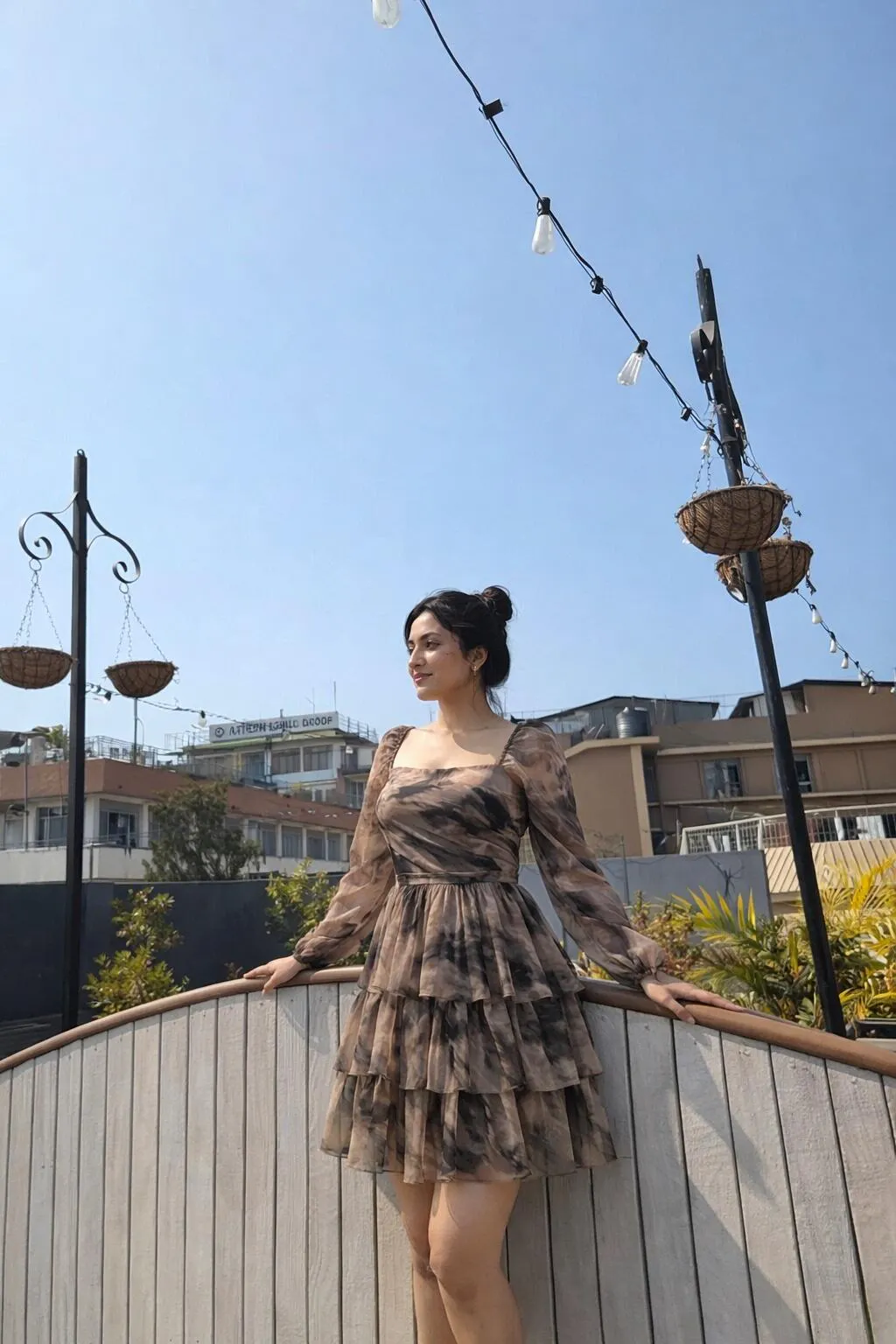 Embrace effortless elegance with this earthy tie-dye mini dress, designed to make a subtle yet striking statement. Featuring a soft square neckline and sheer long sleeves with gentle gathers, this dress offers a balanced blend of structure and flow. The cinched waist enhances the silhouette, while the layered tiered skirt adds playful movement. Crafted in lightweight, breathable fabric with natural brown and charcoal tones, it’s perfect for brunch dates, resort evenings, or casual celebrations. Style it with minimal heels or ankle boots for a chic, modern look.