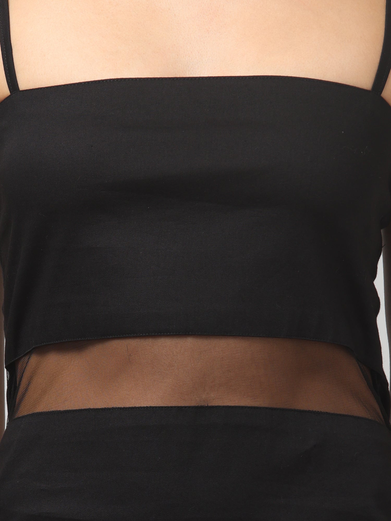 The Midnight Illusion Dress is a bold and minimalistic black bodycon mini that embodies modern confidence and after-dark elegance. With a sleek silhouette, delicate spaghetti straps, and a sheer mesh midriff panel, this dress plays with contrast and structure while keeping the overall look effortlessly polished. It’s designed for the woman who isn’t afraid to turn heads — subtle in cut, striking in execution.