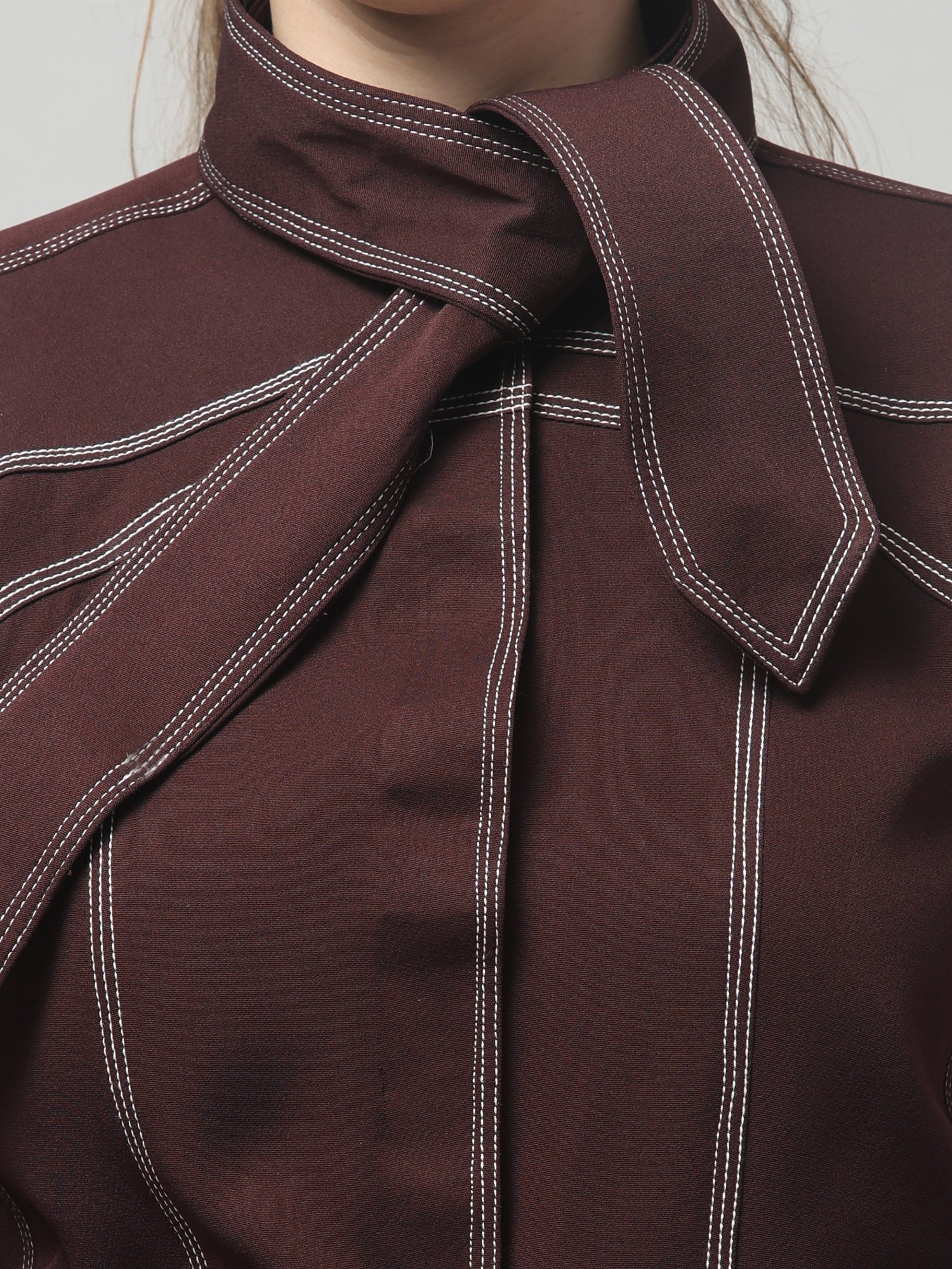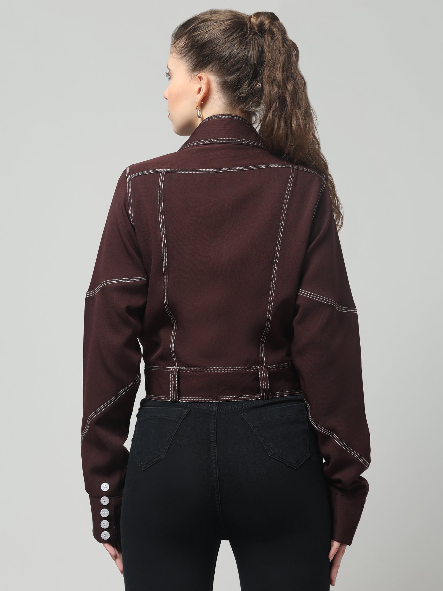 Bold, structured, and fashion-forward — the Wine Stitch Detail Belted Shirt is designed to make a statement. Featuring contrast white stitching, silver buttons, and a matching waist belt for definition, this piece is topped off with a detachable tie-up collar for versatile styling. It’s where utility meets elevated chic.